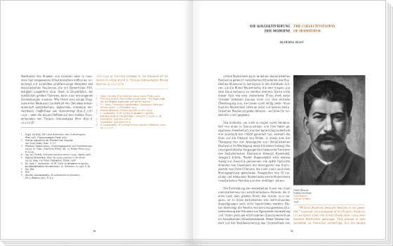 Meine Idee war, mit Schrift, brauner Auszeichnungsfarbe für Übersetzung und Bilderrahmen sowie Ausrichtung der Überschriften an der Mittelachse visuell an Drucksachen aus der Stalinzeit anzuknüpfen.