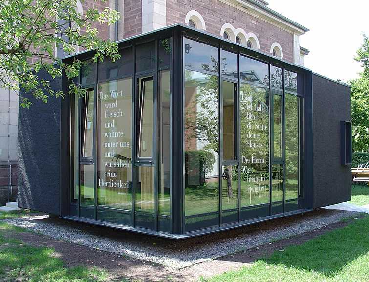 Bei der Sakristei bilden die Materialien schwarzer Beton und transparentes Glas ein spannungsvolles Zusammenspiel. Ich fand, dass es zu dieser Materialität und der Umgebung am besten passte, die Schrift in Sandstrahloptik aufzubringen.