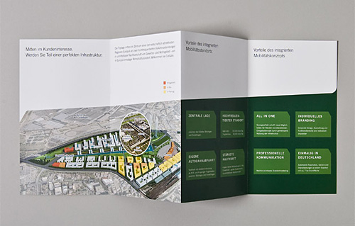 Die Infobroschüre, mit der Investoren geworben werden sollten, hat einen mit Prägung veredelten Einband und ist als Wendebroschüre konzipiert: der Inhalt ist zweisprachig in zwei Hälften aufgeteilt. Zusätzlich fasst ein Infofolder die Standortvorteile übersichtlich in einer Schaugrafik zusammen. Eine Microsite stellte alle Informationen online bereit.