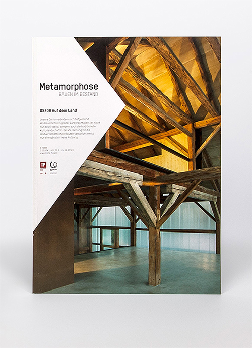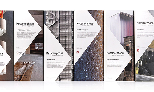 Das Thema Bauen im Bestand ist in den letzen Jahren verstärkt in den Fokus der Architektur geraten, wurde aber noch nie als Kernthema einer Zeitschrift behandelt. „Metamorphose“ setzt genau hier an und beauftragte Ippolito Fleitz Group mit dem Entwurf eines Layoutkonzepts. Die Seiten sind wie eine Sammelmappe aufgebaut, auf denen Text- und Bildinhalte frei platziert werden können. Infoboxen fassen alle wichtigen Fakten und Daten der Projektbeteiligten zusammen. Farbige Rahmen, angelehnt an die Farbreihen Le Corbusiers, strukturieren die Inhalte thematisch und ermöglichen dem Leser eine schnelle Orientierung. Der stilisierte Pfeil auf dem Titel steht stellvertretend für eine Sichtweise auf ein Bauprojekt.