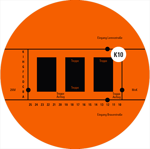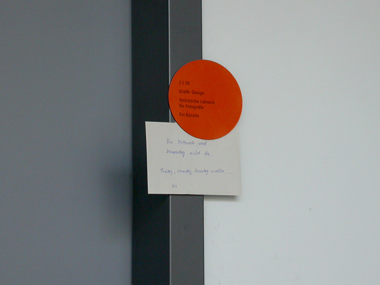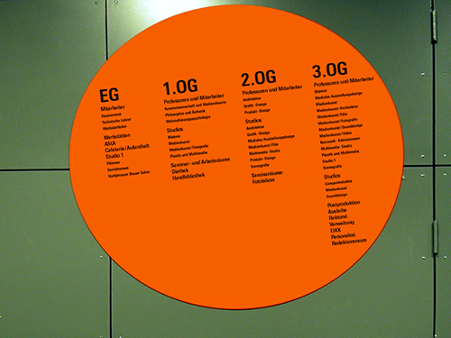 Für die Hochschule für Gestaltung Karlsruhe sollte ein Leitsystem entworfen werden. Die besondere Herausforderung bestand darin, dem denkmalgeschützten Gebäude, eine ehemalige Munitionsfabrik, gerecht zu werden. Wir analysierten die Architektur und beschlossen, uns diese zu Nutze zu machen: Mit Metallplatten verkleidete Wände und metallene Türrahmen boten sich als ideale Befestigungsträger für Magnetschilder an. Die orangefarbigen runden Schilder bilden einen maximalen Kontrast zur grau-weißen rechtwinkligen Architektur. Durch die magnetische Befestigung bleibt das Leitsystem lebendig: die Schilder hängen nie auf gleicher Höhe und werden dem kreativen Charakter der Hochschule gerecht. Etwas Anarchie durch gelegentliche Schilderwanderung wurde bewusst in Kauf genommen und fördert ab und an die persönliche Kommunikation.